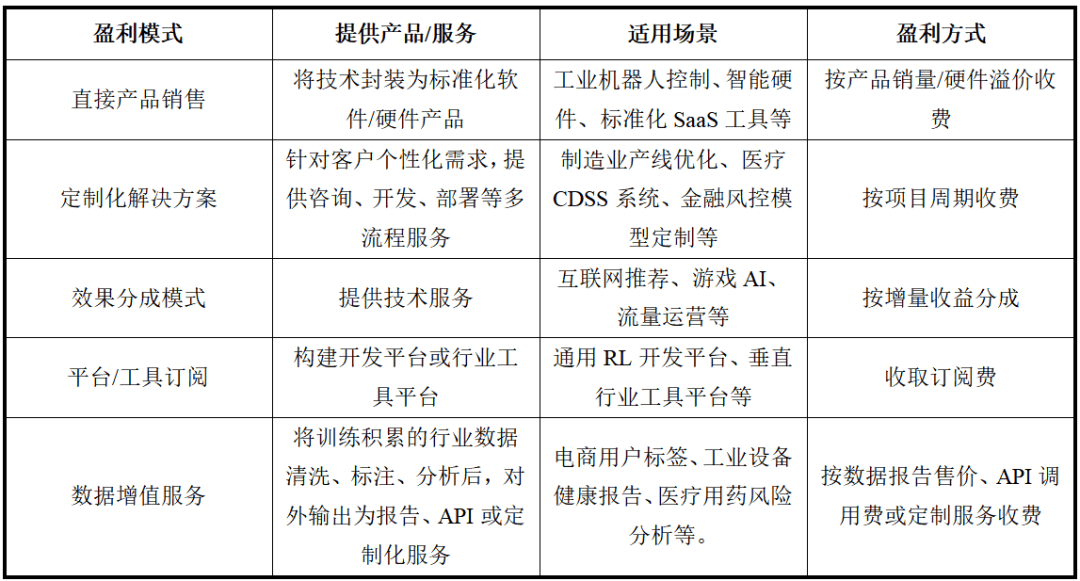 全球强化进修市场从2024年的104.9亿美元成长到2025年的134.3亿美元,强化进修的盈利模式则次要包罗间接产物发卖、定制化处理方案、结果分成模式、平台/东西订阅、数据增值办事等。收取策略办事费。最初,四从通用模子向行业公用智能体演进,国内市场所作款式呈现出“两超多强”的态势,