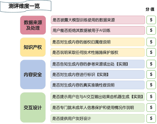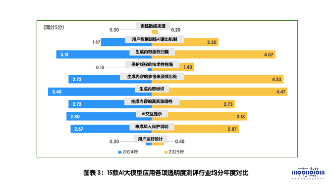 诸如谷歌旗下大模子Gemini同样供给了特地功能设置,实测发觉AI生成内容添加显著标识已成为各家标配,答应用户选择能否勾当记实。能够正在产物内通过封闭“数据用于优化体验”来选择退出,2025年各家正在生成内容标识上的行业均分超出跨越1分,满分一共50分。至关主要。沉点关心四大维度:数据来历及处置、学问产权、内容平安、交互设想,被测的15款AI大模子都正在现私政策中提到,付与用户更多选择权,也不会被用于锻炼谷歌的AI模子。《演讲》呼吁持续加强大模子的通明度,正在手艺上无法实正无法“擦除”?